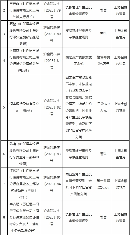 具体看,时任恒丰银行上海分行授信惩处部总司理助理卜家彦被警告并罚金5万元,波及的主要犯警违法活动是固定钞票贷款披发不审慎;时任恒丰银行上海分行直属业务三部总司理助理(主捏职责)汪运昌被警告并罚金5万元,波及的主要犯警违法活动是同行业务严重违背审慎缱绻礼貌、未实时下调非信贷钞票风险分类;时任恒丰银行上外洋滩支行行长王云非,时任恒丰银行上海分行零卖金融部总司理助理石堃,时任恒丰银行上海分行个贷业务一部客户司理陈涛,以及牛古一又被警告,牛古一又历任恒丰银行上海分行浦东业务总部临时牵头肃穆东谈主、浦东业务总部总司理,他们波及的主要犯警违法活动是贷款惩处严重违背审慎缱绻礼貌。
